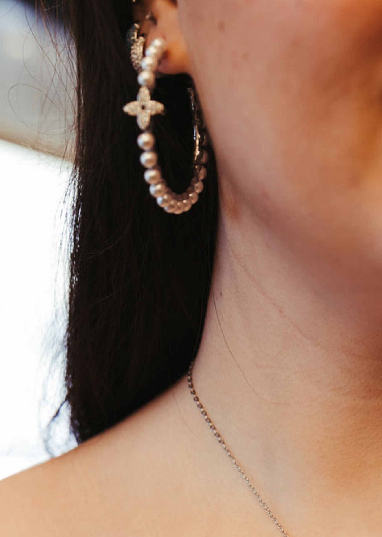 Step into the elegance of old-world opulence with our Park Avenue Pearl Hoops — where classic pearls meet modern luxury. These statement hoops feature luminous ivory pearls intricately strung along a sculpted band, adorned with a radiant pavé crystal motif that captures the light with every turn.