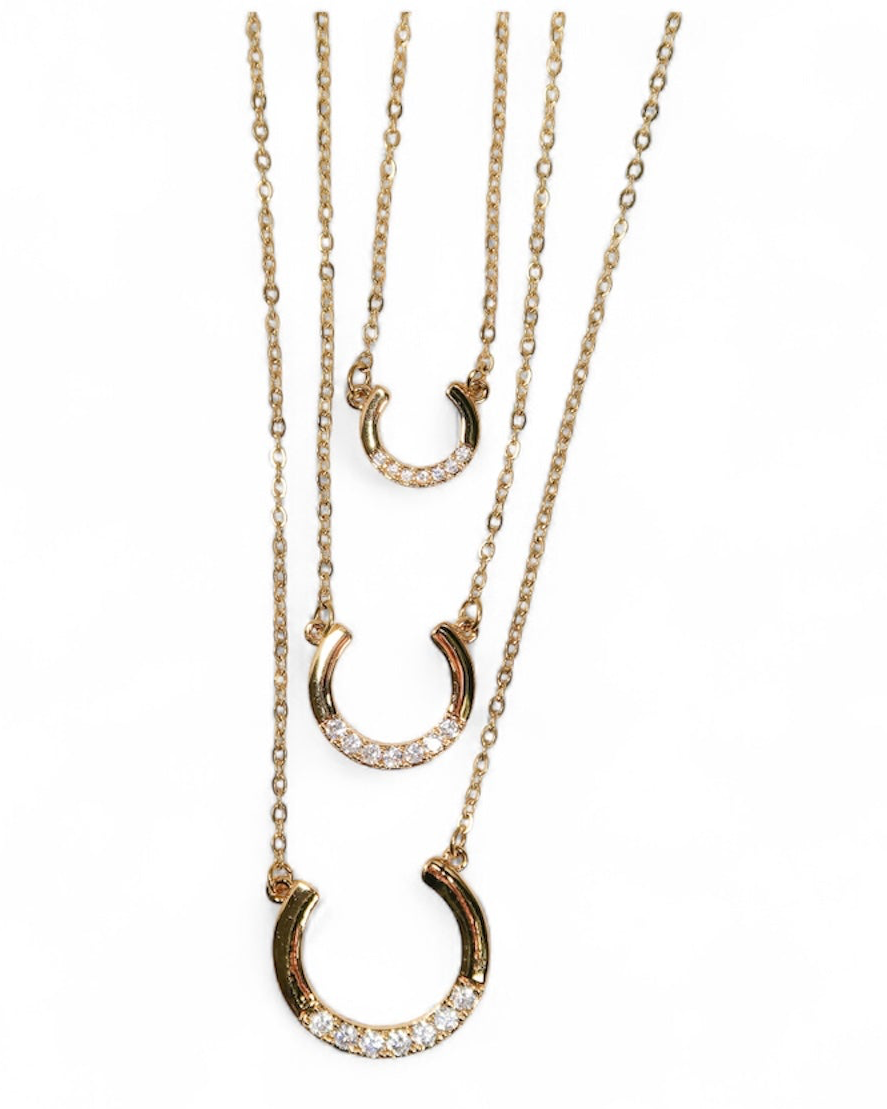 Slayer offers a gorgeous Gold 3-Piece crystal horseshoe necklace set. Each necklace features an increasingly larger charm as well as slightly longer chain creating a lovely layered trio.