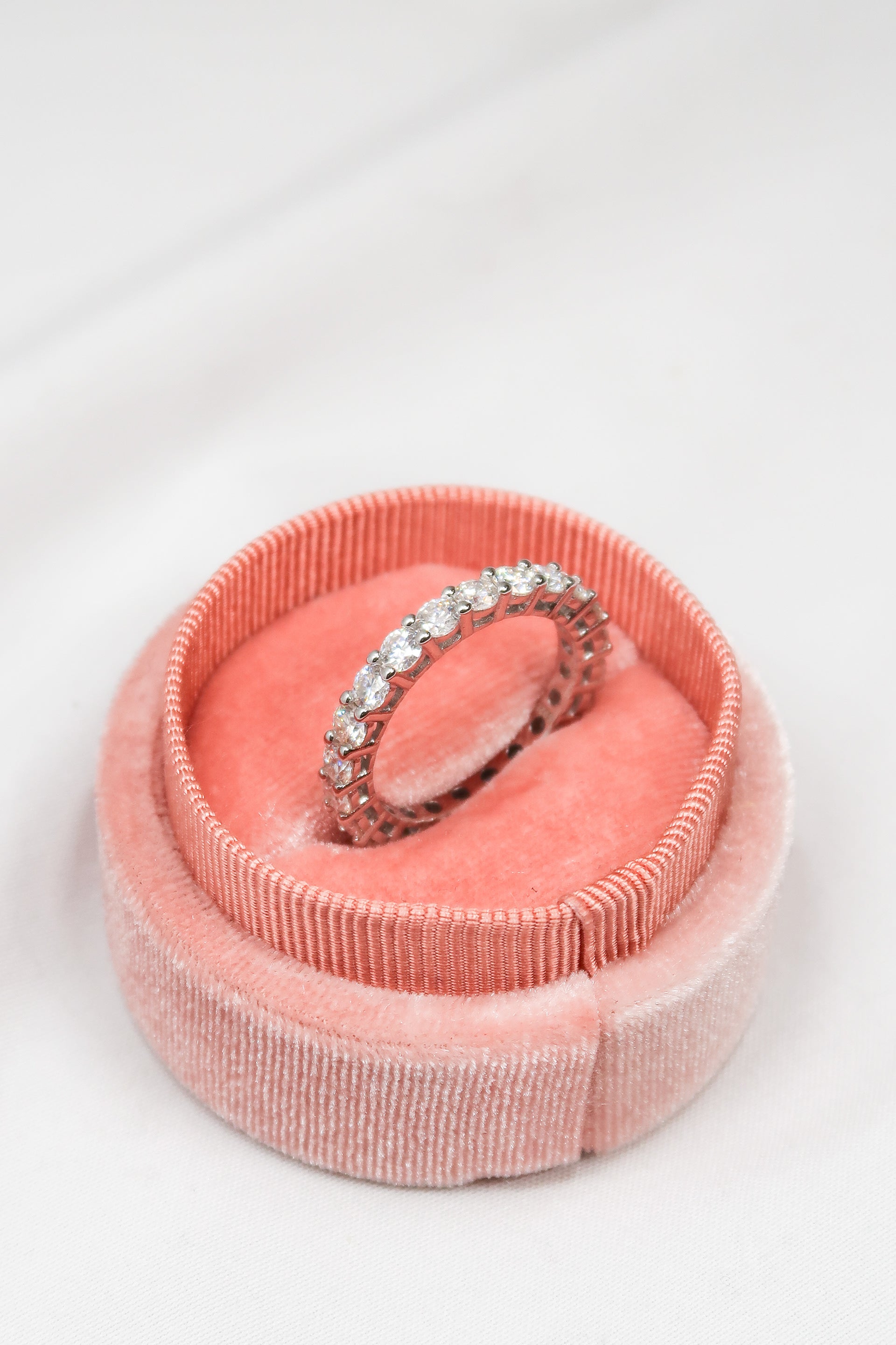 The Forever Yours is an exquisite .925 Sterling Silver eternity band ring that will capture your heart and never let go. The eternity band of this beautiful ring represents the everlasting nature of your love. The ring is dotted with a total of 1.5 carats of brilliant cut GRA Certified Moissanite stones, each one sparkling with a brilliant radiance that will take your breath away. This ring is the perfect way to celebrate a special occasion, whether it's a milestone anniversary, engagement, or just because.