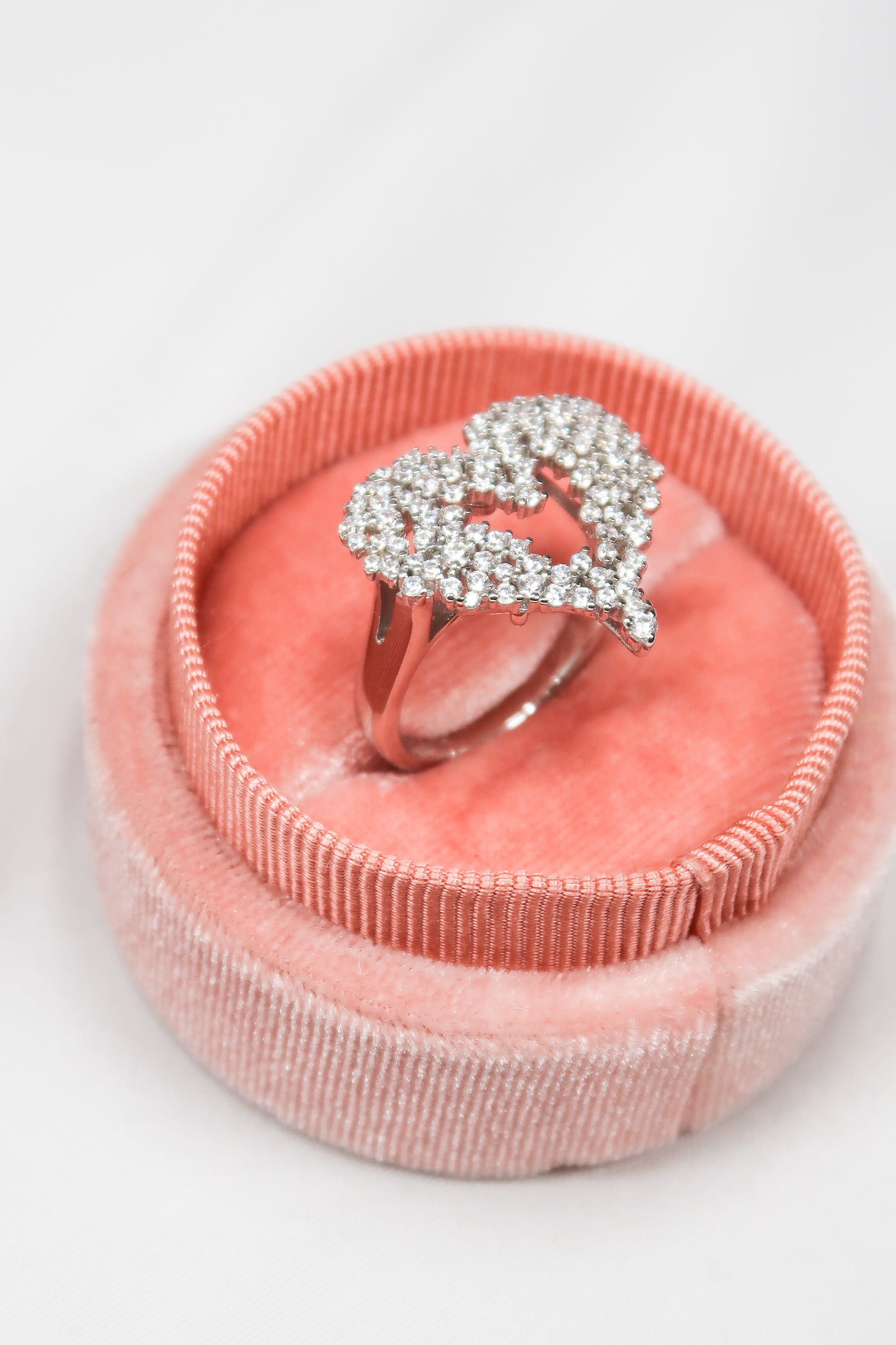 Capture hearts with this playful .925 Sterling silver ring featuring dazzling moissanite clusters arranged in a romantic heart shape. The brilliant sparkle catches light from every angle, making this the perfect accessory for showing off your fun-loving style while adding a touch of shimmer to any outfit!