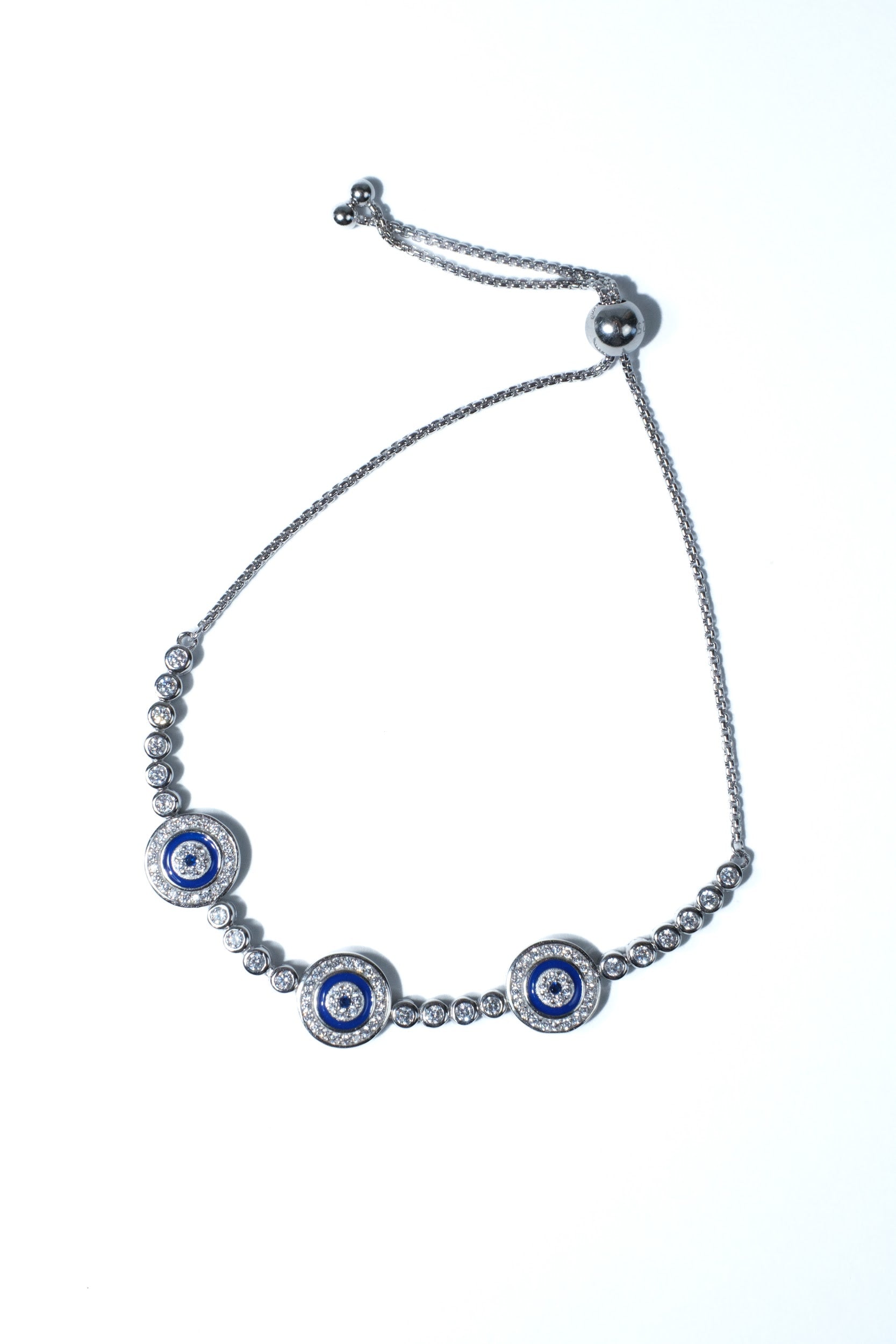 The Manifest Bracelet provides an elegant statement with its .925 sterling silver craftsmanship and circular crystal design. The bracelet is adorned with a crystal and sapphire evil eyes going around the bracelet, resulting in a high-end and unique look. Truly perfect for any occasion.