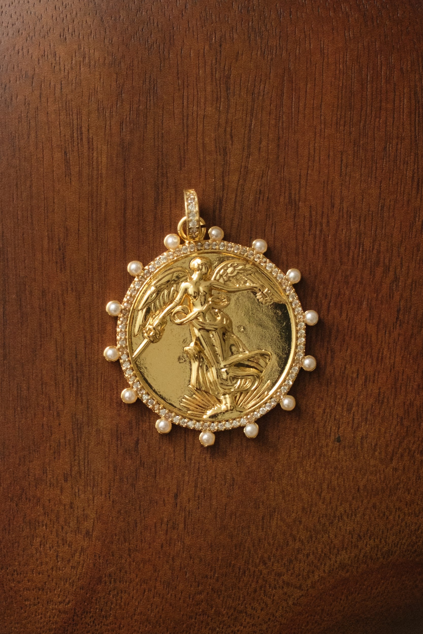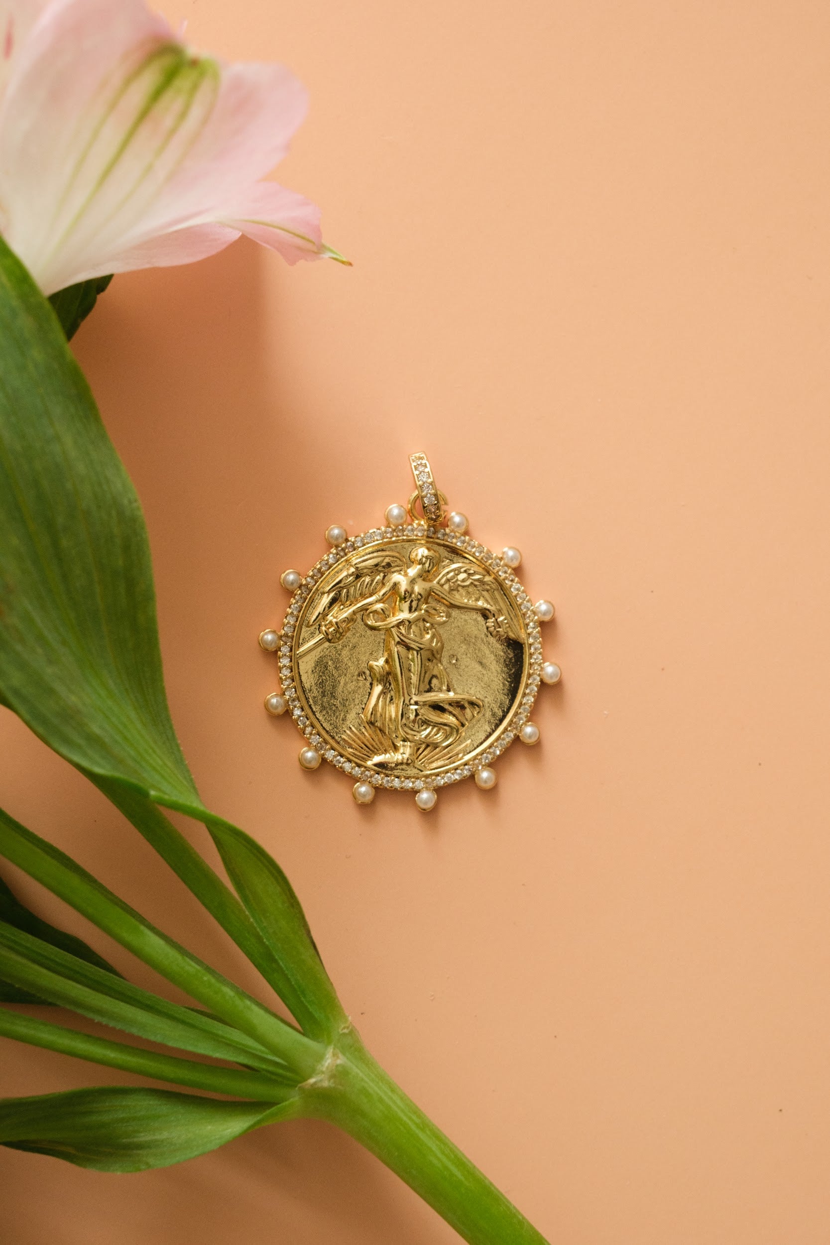 Introducing the She's a Lady pendant charm, crafted from high-quality 316L stainless steel. This elegant piece features an angelic lady in warrior pose, flanked by a glorious sunset. Adorned with mini pearl shell orbs, the 1-inch charm exudes sophistication and grace also paired with a detachable clasp covered in zircon stones. Elevate your style with this exclusive design.