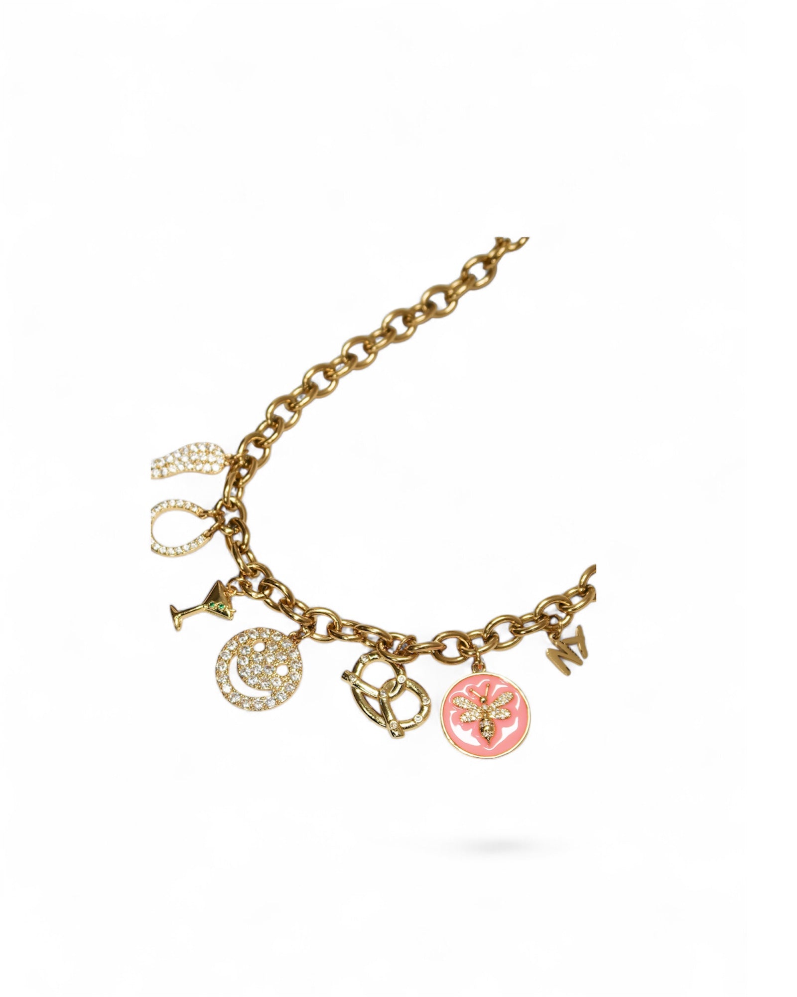 Take a fearless fashion risk with this adjustable 316L stainless steel necklace inspired by New York City. Enhance any outfit with its chunky up to 18 inch adjustable Rollo chain and seven pendants, including a sparkling Italian pepper, lucky horseshoe, whimsical smiley face, martini glass, mini pretzel, dragonfly on a Pink colored disc and NY, each pendant is highlighted with zircon stones. The perfect piece to make a bold statement!